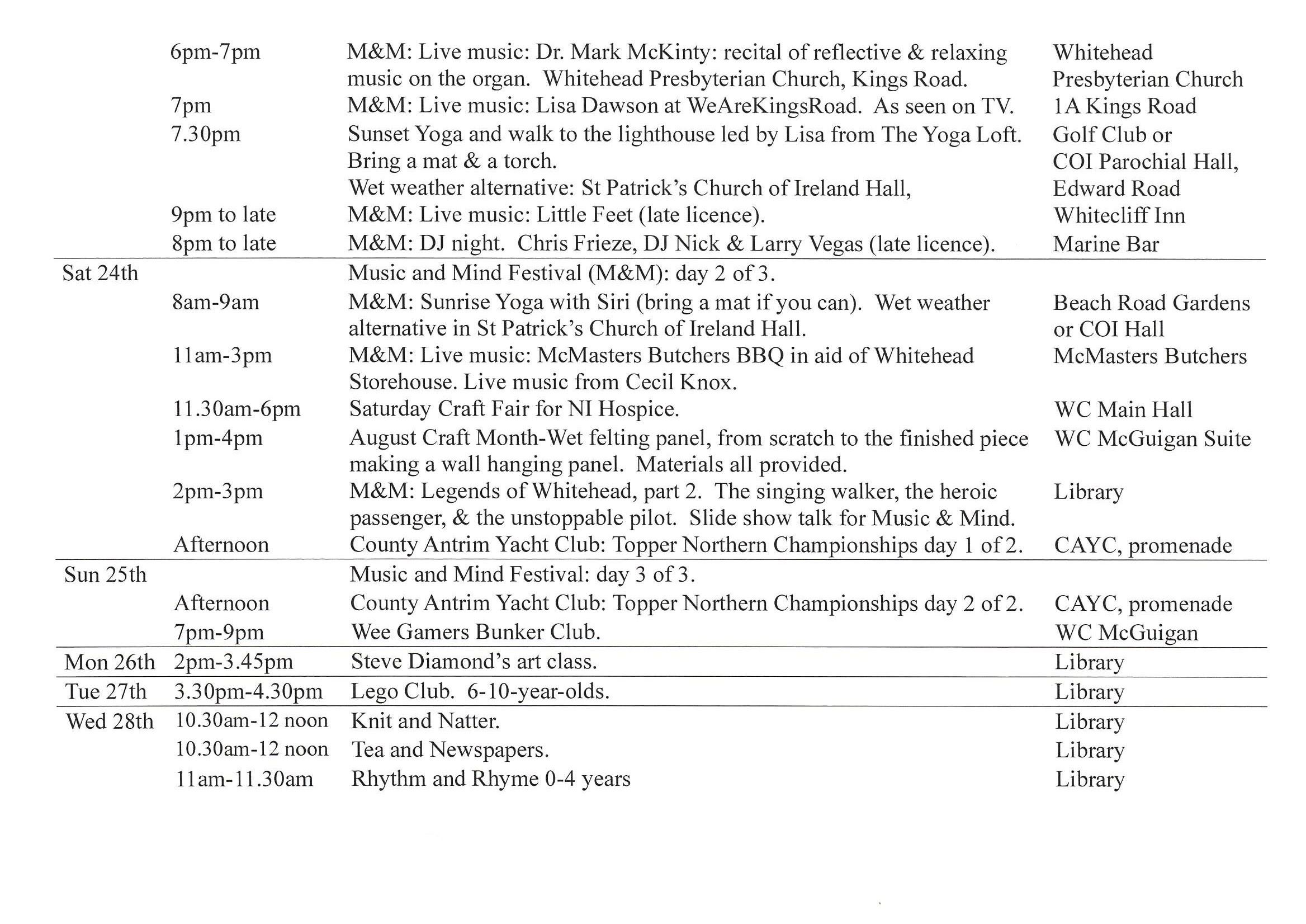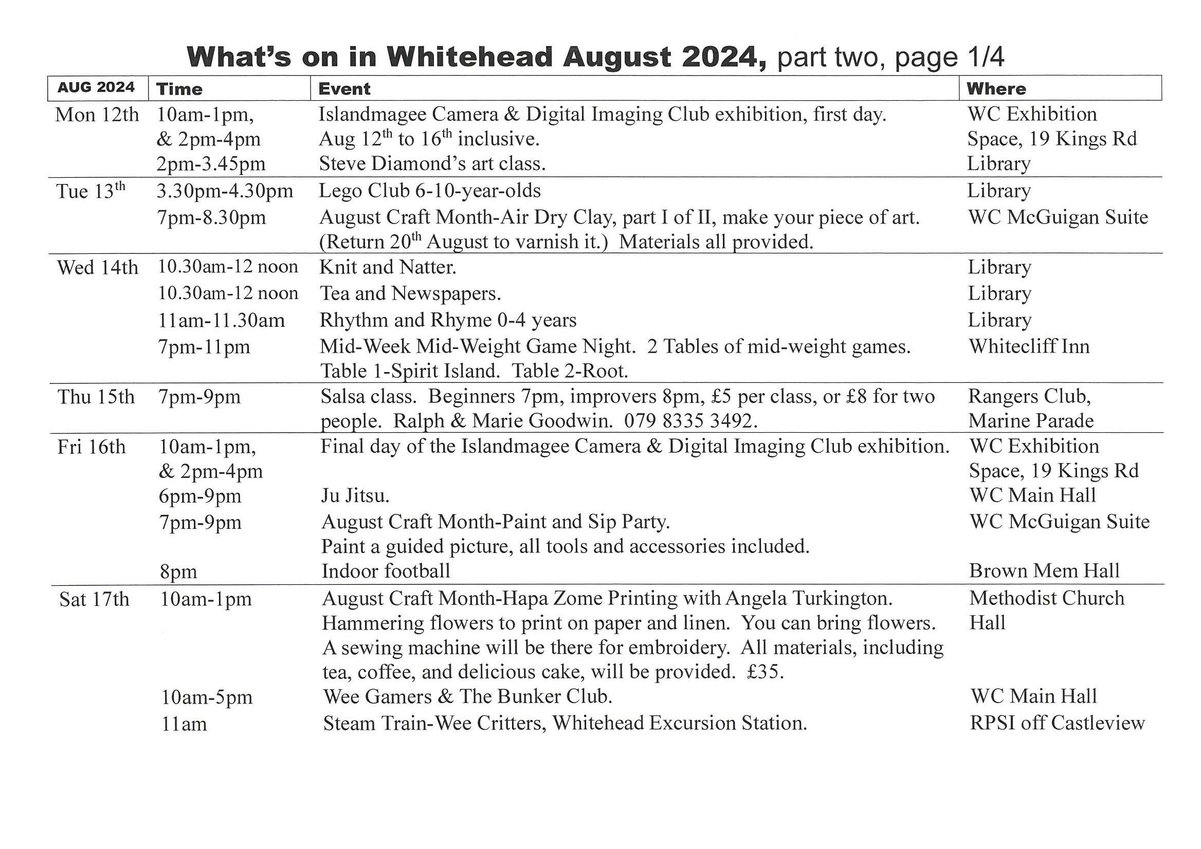 August Part 2: What’s On Whitehead Leave a Comment / events / By Whitehead CA From sports clubs to craft fairs- find out What’s on in Whitehead this month. Pg 1 Pg 2 Pg 3 Pg 4