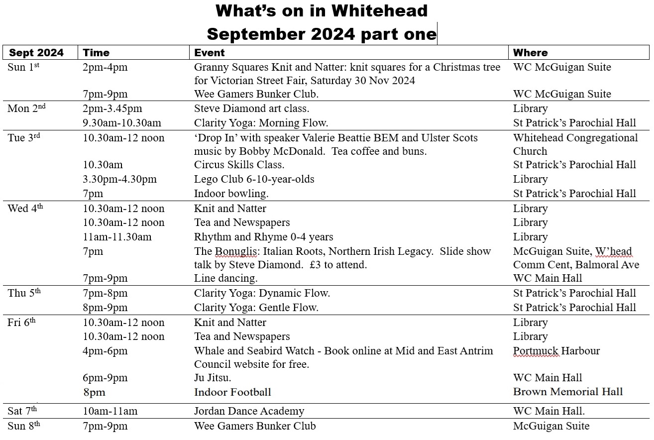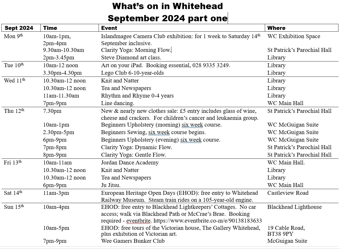 September: What’s on Whitehead Leave a Comment / events / By Whitehead CA From sports clubs to craft fairs- find out What’s on in Whitehead this month- Page 1 Page 2
