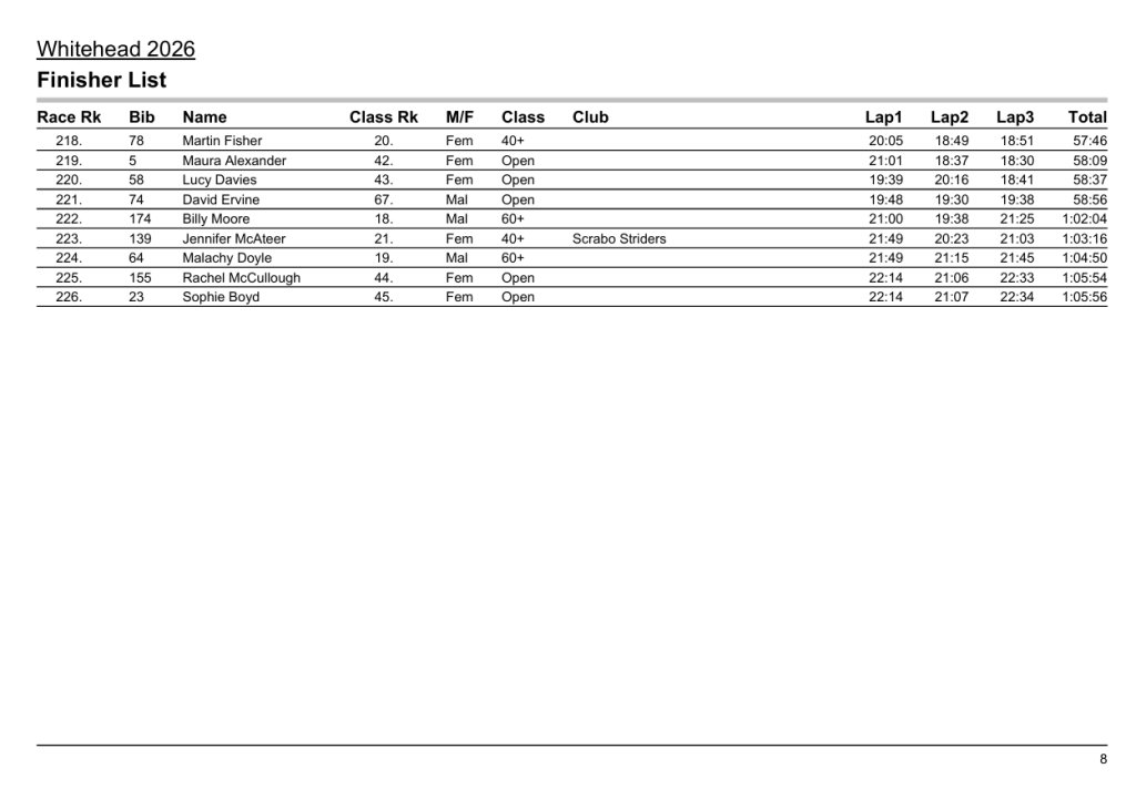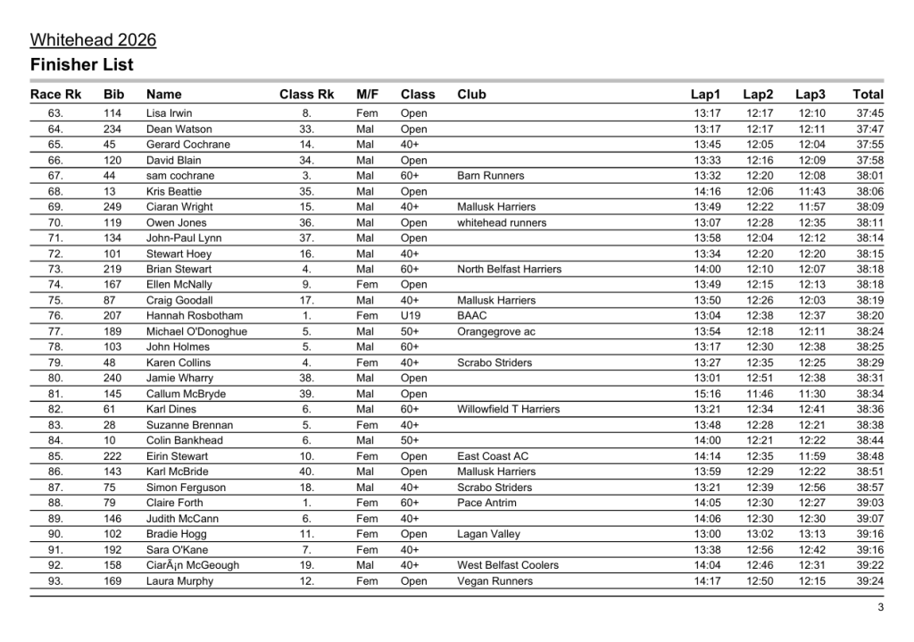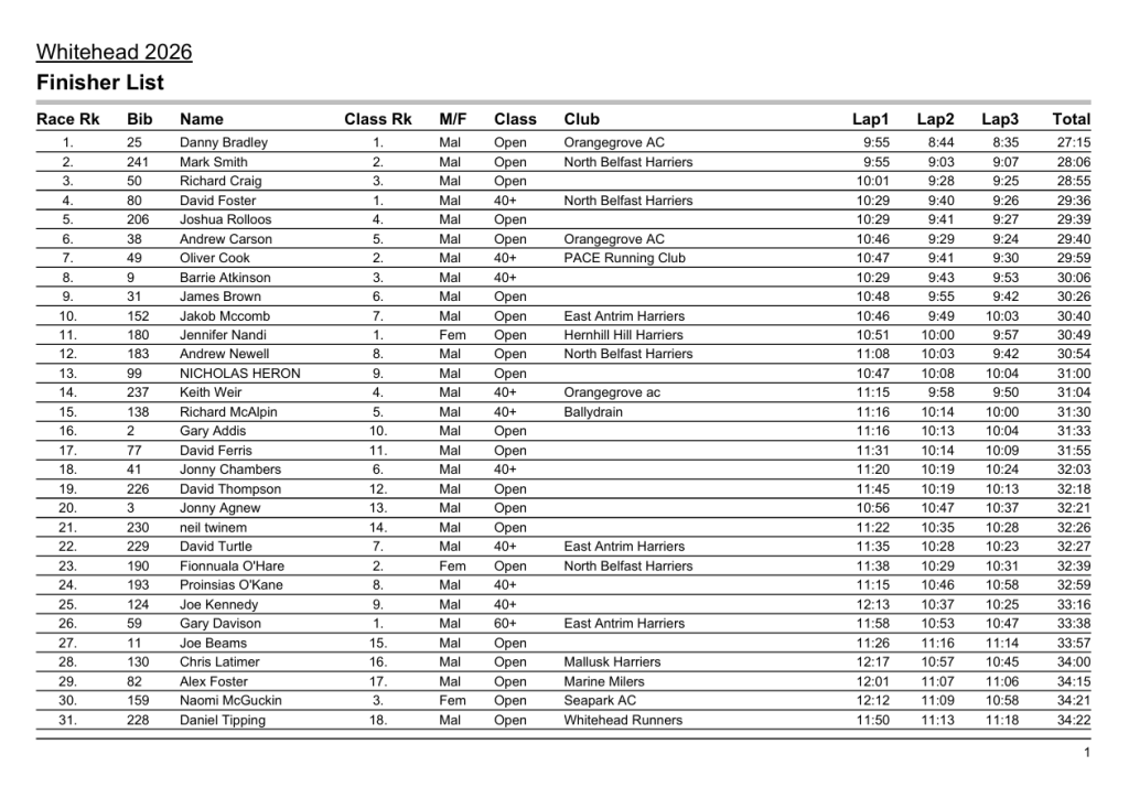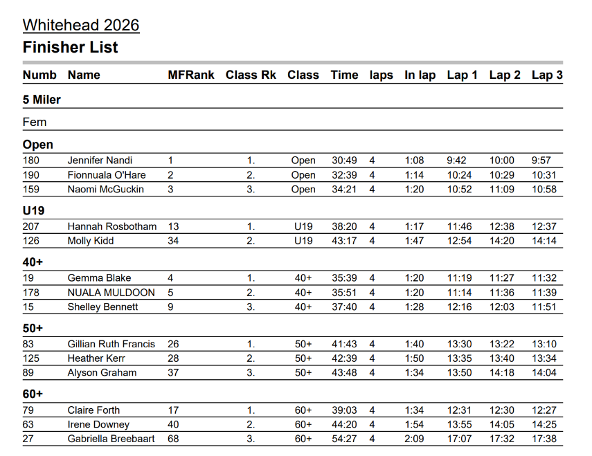 Below is a table of the placed runners in each category and then all finishers times. Thanks again and enjoy the rest of your Easter holiday!